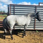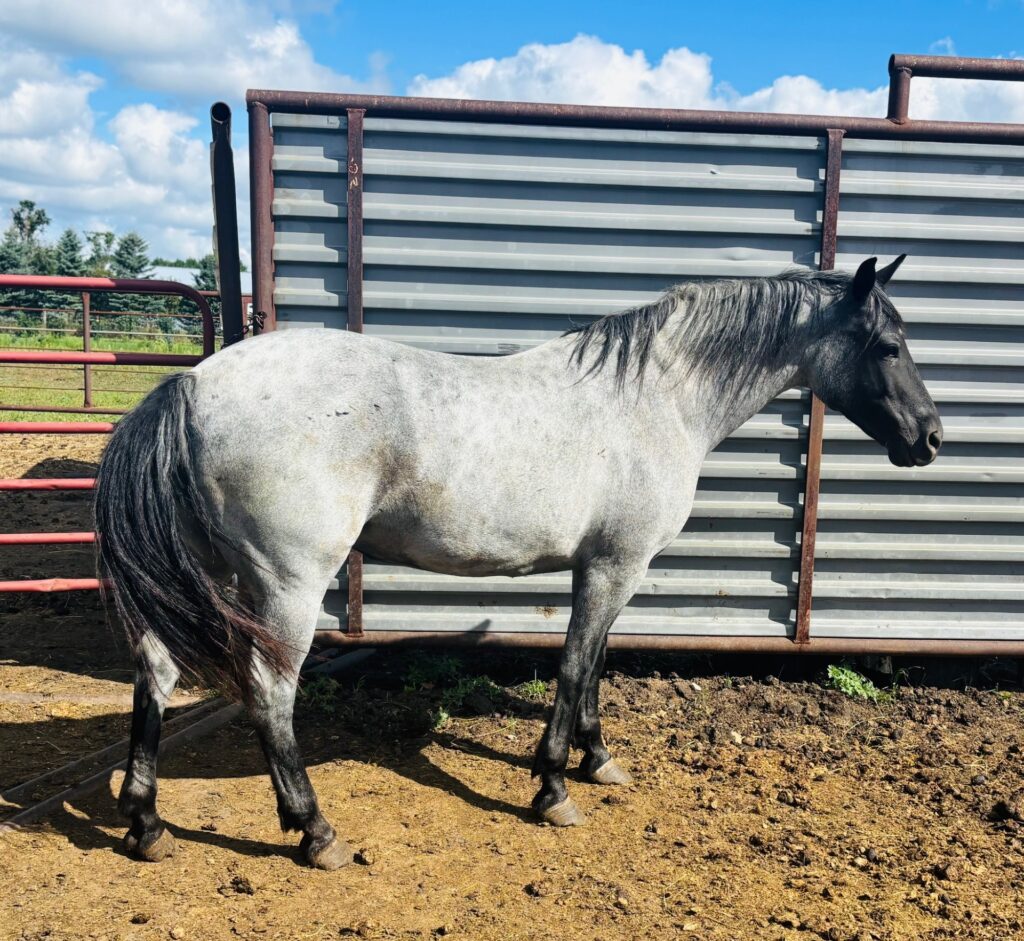 Lot 165: Draft x Mare. “Belle” Blue Roan. 8 Year Old. 15.2 hh. Belle is an outstanding True Blue Roan, Percheron Quarter Horse cross Mare. This stunning Mare has had some very nice blue roan foals. Belle was ridden and driven as a two and three year old but has been a broodmare since. She is bred to a Blue Roan Percheron Brabant Stallion for a May 2026 foal. She is a must see!