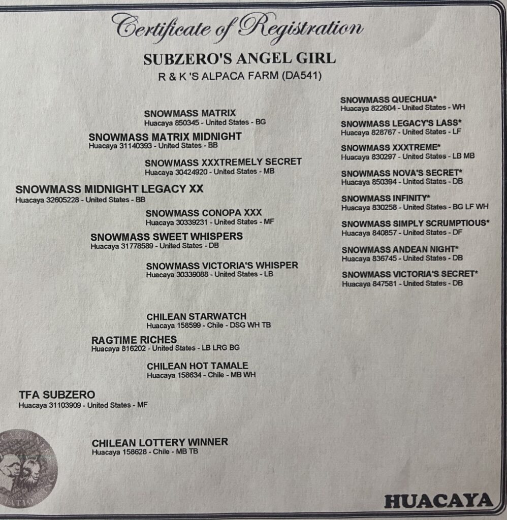 SUNZERO’S ANGEL GIRL #35325062. Female, DOB: 9/18/17. Primary Color, 301 Medium Brown. Secondary Color, 360 Bay Black. Snowmass Midnight Legacy XX x TFA Subzero.
