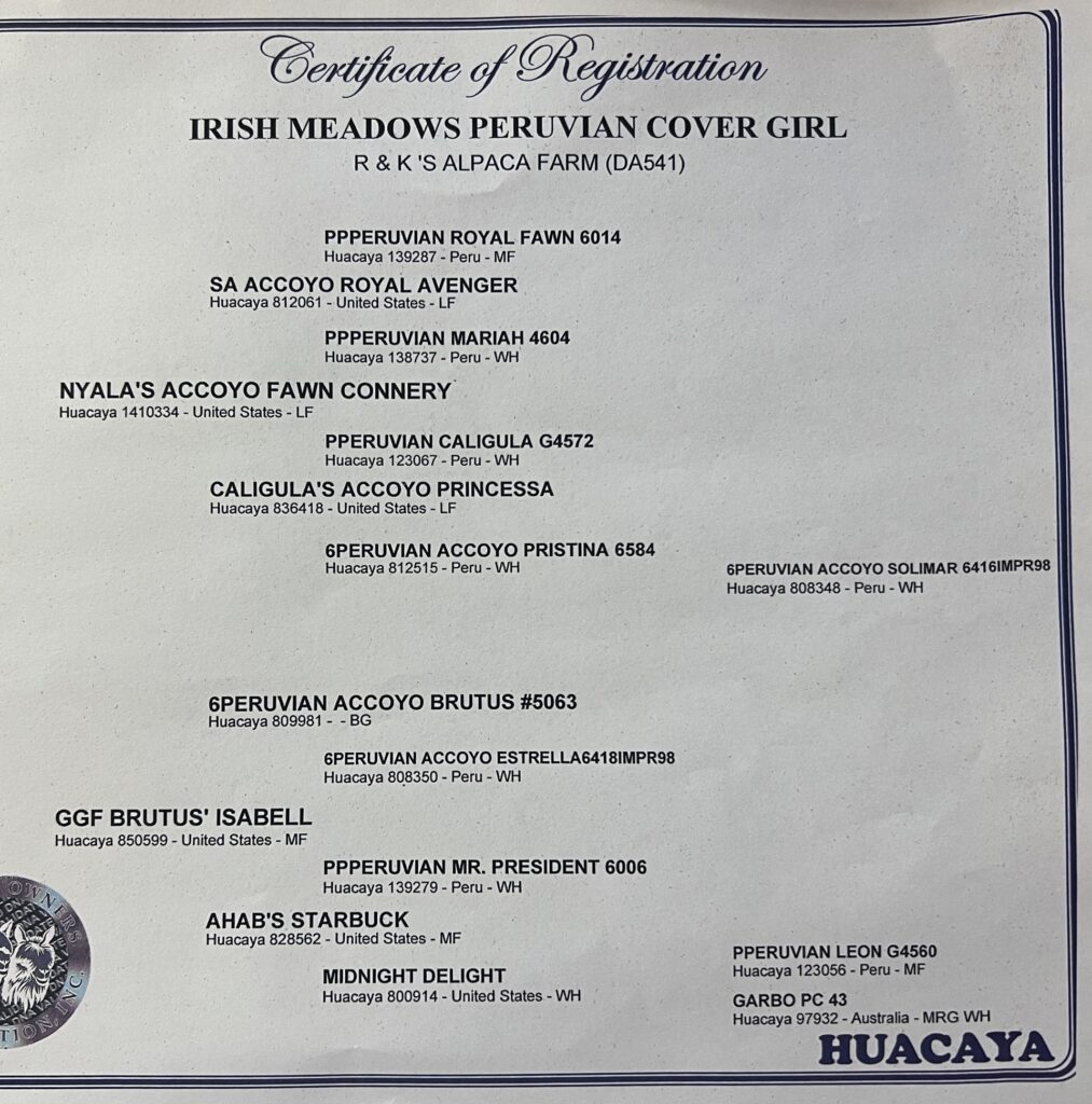 IRISH MEADOWS PERUVIAN COVER GIRL #31365345. Female, DOB: 10/8/08. Primary Color, 100 White. Nyala’s Accoyo Fawn Connery x GGF Brutus’ Isabell.
