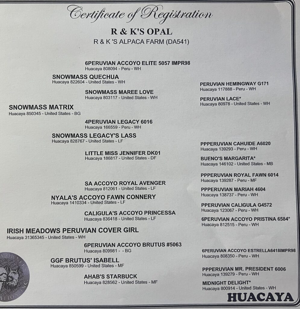 R & K’S OPAL #36298495. Female, DOB: 5/11/23. Primary Color, 100 White. Snowmass Matrix x Irish Meadows Peruvian Cover Girl. Her Mother also in the sale, listed below.